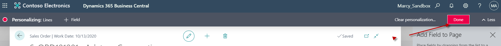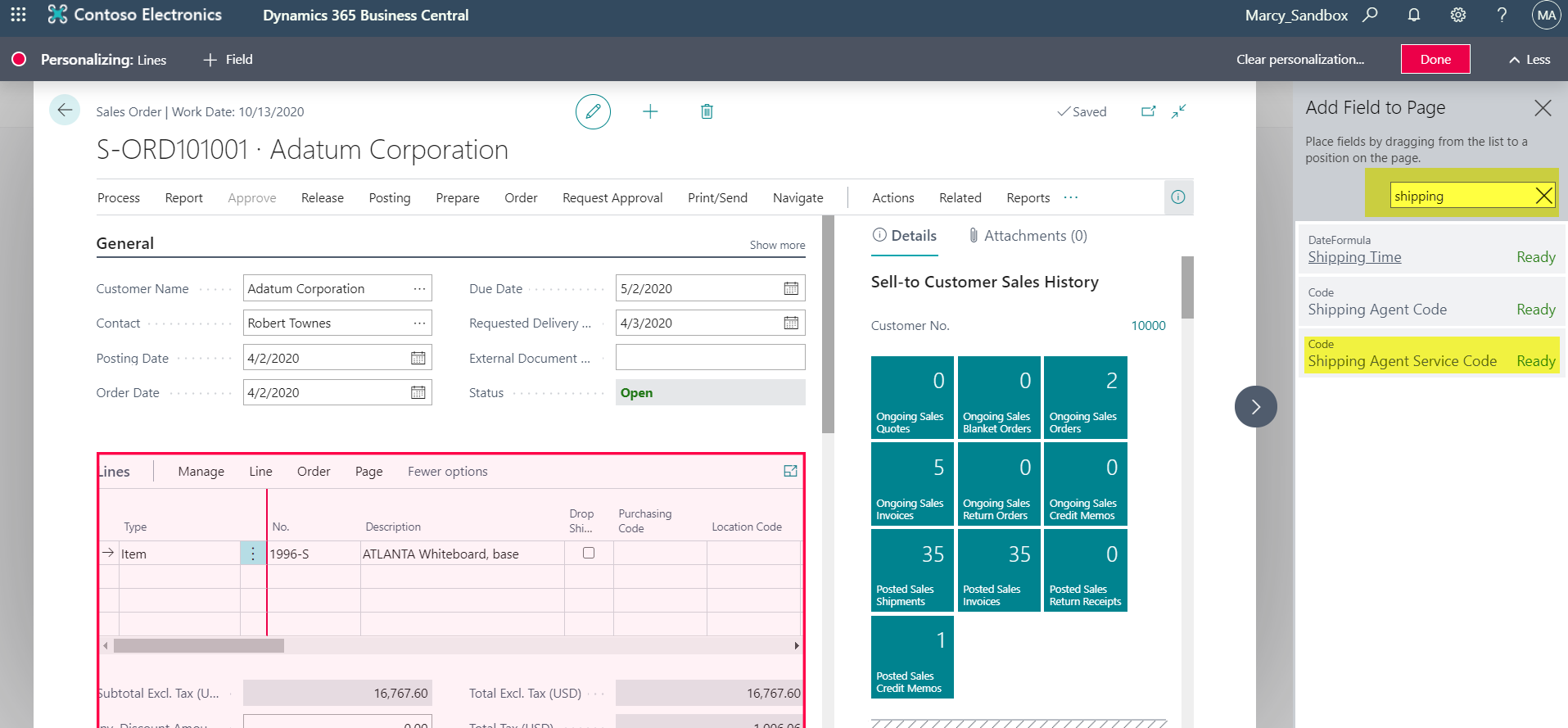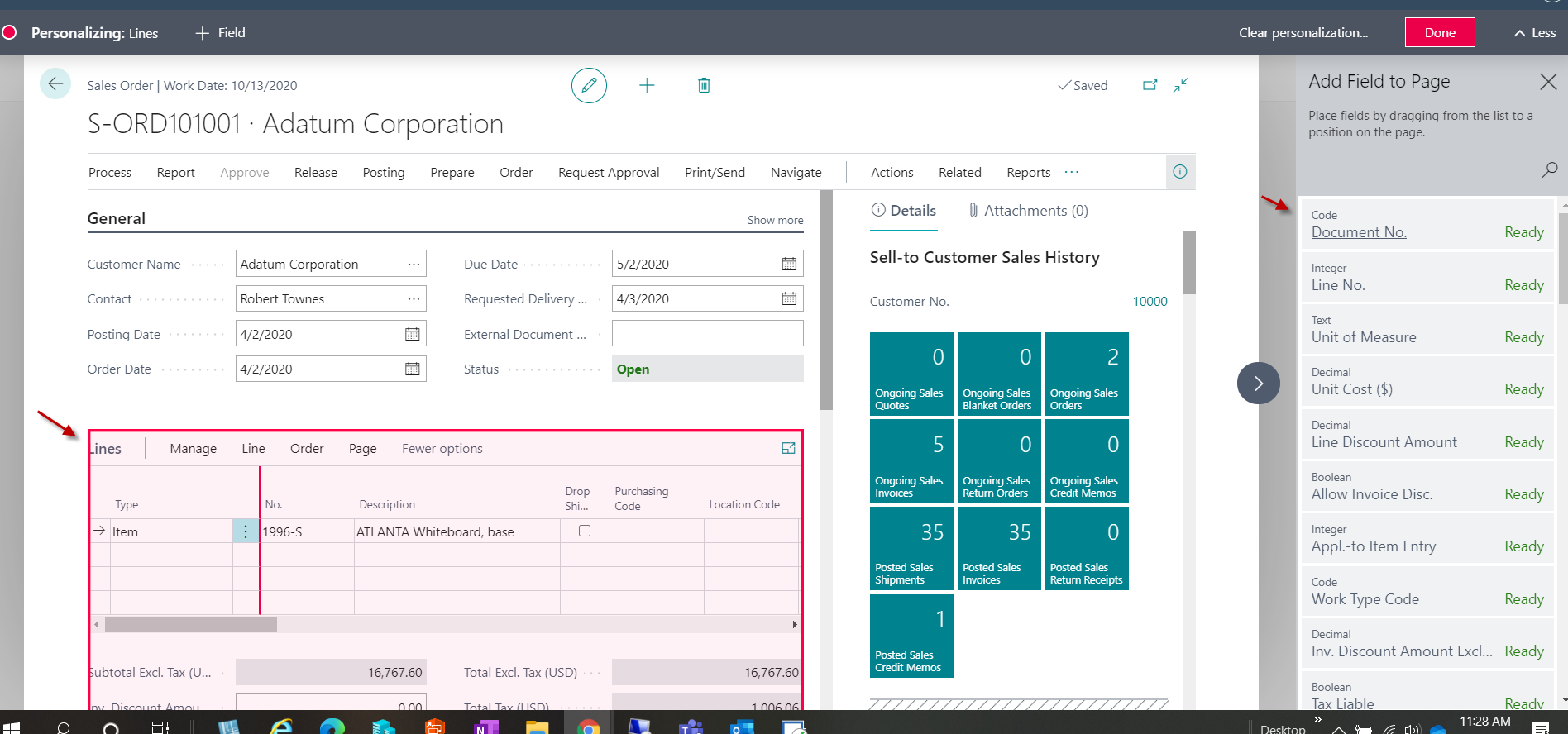 Click on the Lines area which will create a red outline and on the right side of the screen the fields available to add to the Sales Lines area will show.