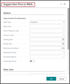 - Choose the OK button to fill in the lines on the Sales Price Worksheet page with the suggested new prices, indicating that they are valid for the selected sales type.