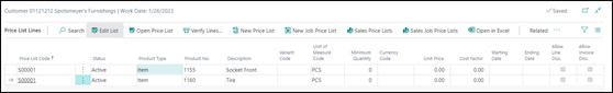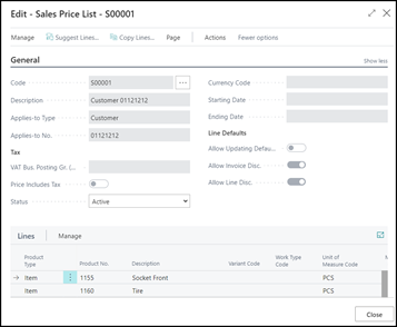 By default, the status of new price lists is Draft. When you're done adding lines and want the price calculation engine to include them, you can change the status to Active. To review price lists and prices that apply for specific customers or vendors, on the Customer page, choose Sales Price Lists or, on the Vendor page, choose Purchase Price Lists. You can view price list lines in various price lists by choosing Sales Prices or Purchase Prices from the Item and Resource pages.