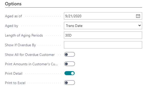 Show All for Overdue Customer - Specifies if you want to include the open customer ledger entries that are overdue. These entries will be calculated based on the period in the Show if Overdue By field. If the Show All for Overdue by Customer field is selected, then you must enter a date in the Aged by field and a date in the Show if Overdue By field to show overdue customer ledger entries.