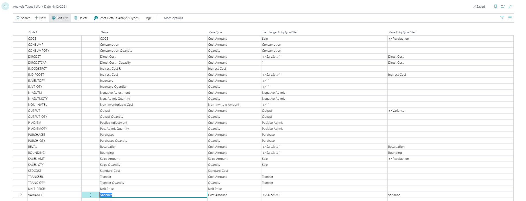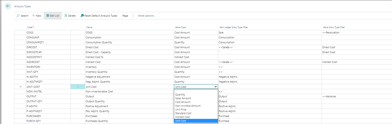 - Each Analysis Type code has a default Item Ledger Entry Type filter, Value Entry Type filter, and Value Type that together define the values in the item and budget entries to retrieve
