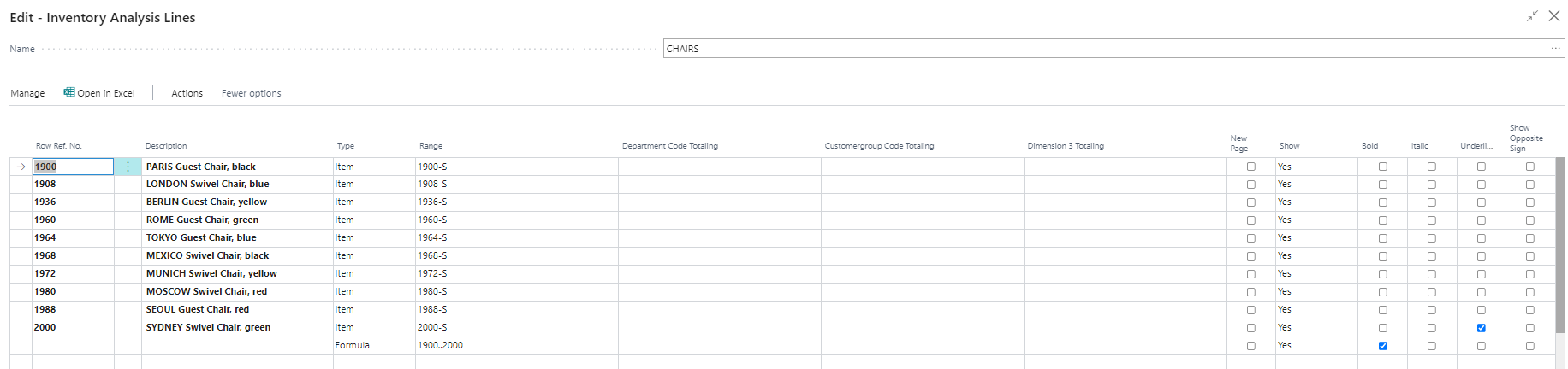 Analysis Lines is like Account Schedule which is the “Row” format of the report. Lines can manually be added or can be inserted from Customer, Vendor and item list depending on the type of report you are creating.