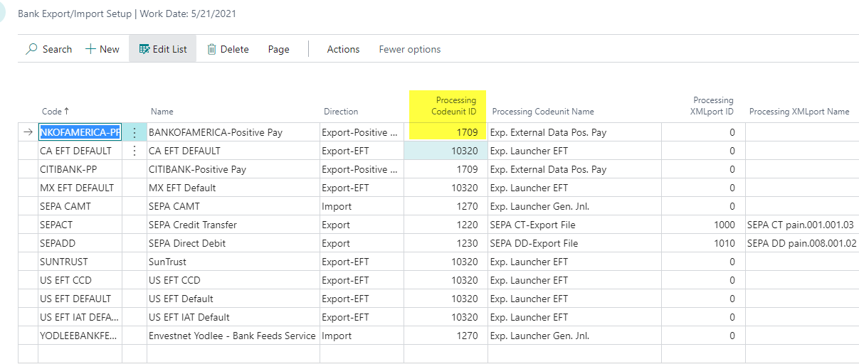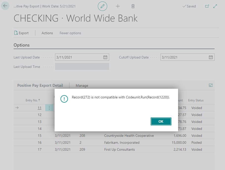 When you setup Positive Pay and get the following error when processing. Go to the Bank Export/Import setup and make sure the positive pay entry you assigned to the bank is using Codeunit 1700 vs. 1709