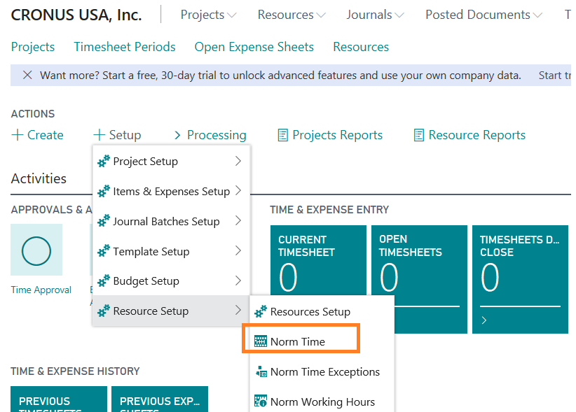 - To setup Norm Time Codes, navigate to the Role Center > Setup > Resource Setup > Norm Time