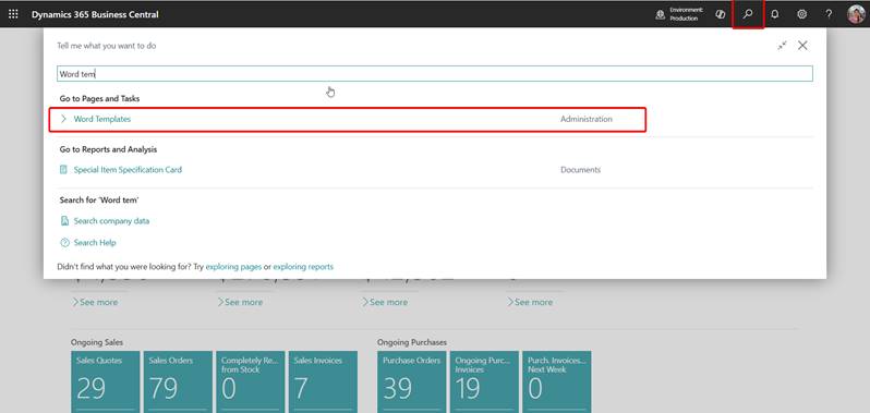 - In Business Central, select the search icon, type “Word Templates,” and open the Word Templates page.