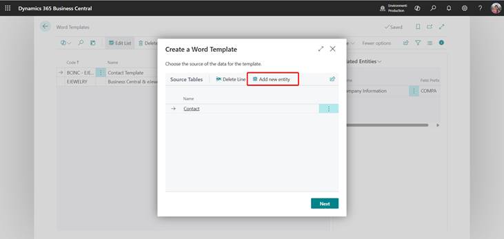 - By default, the Contact table is chosen. To use other data (like Customer or Vendor), click Add New Entity.