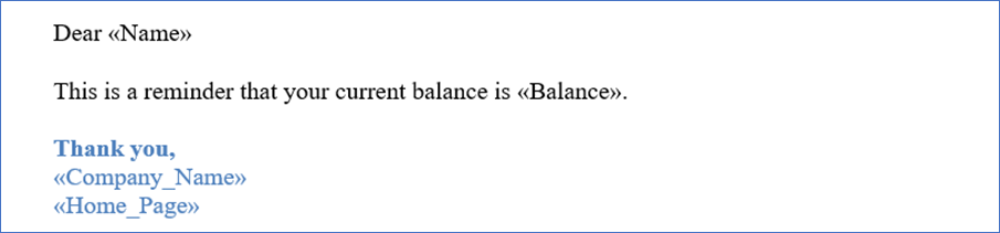 - Use Insert Merge Field to add details like name, balance, or email address.