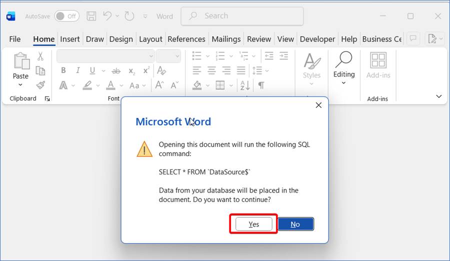 - When prompted with a message like “Opening this document will run an SQL command to retrieve data”, click Yes to allow Word to load the data fields